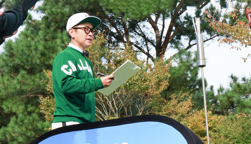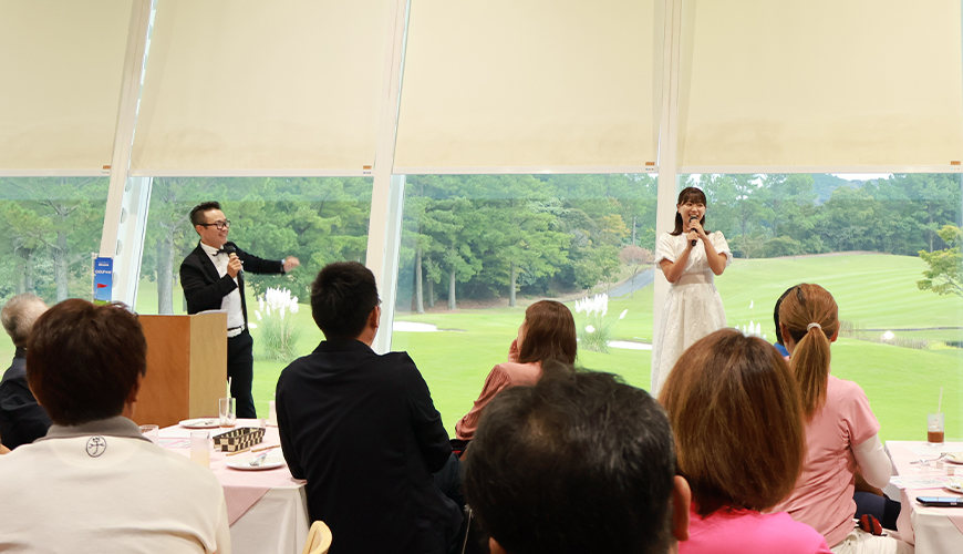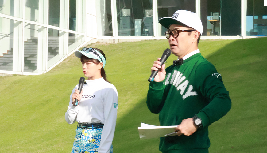 黒田CCさんのユーモアたっぷりの司会。そして、鈴蘭さんとは、ティーショットからゴルフカートに同乗しての移動、カップインまで、各組1ホールごと一緒にラウンドし、会話を楽しんでいただきました!