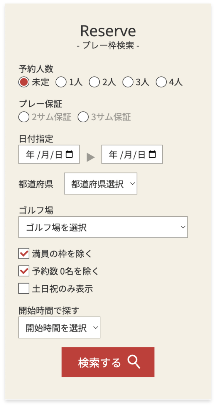 「プレー枠検索」にて、予約人数、プレー保証、日付などを選択し、検索してください。